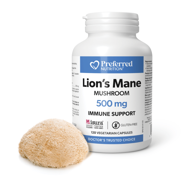 Preferred Nutrition Lion’s Mane Mushroom is a source of fungal polysaccharides with immunomodulating properties. It also provides antioxidants that help protect against free radicals. Each vegetarian capsule contains 500 mg of 10:1 lion’s mane (Hericium erinaceus) extract derived from the fruiting body. It is non-GMO, gluten-free, and suitable for vegetarians and vegans.